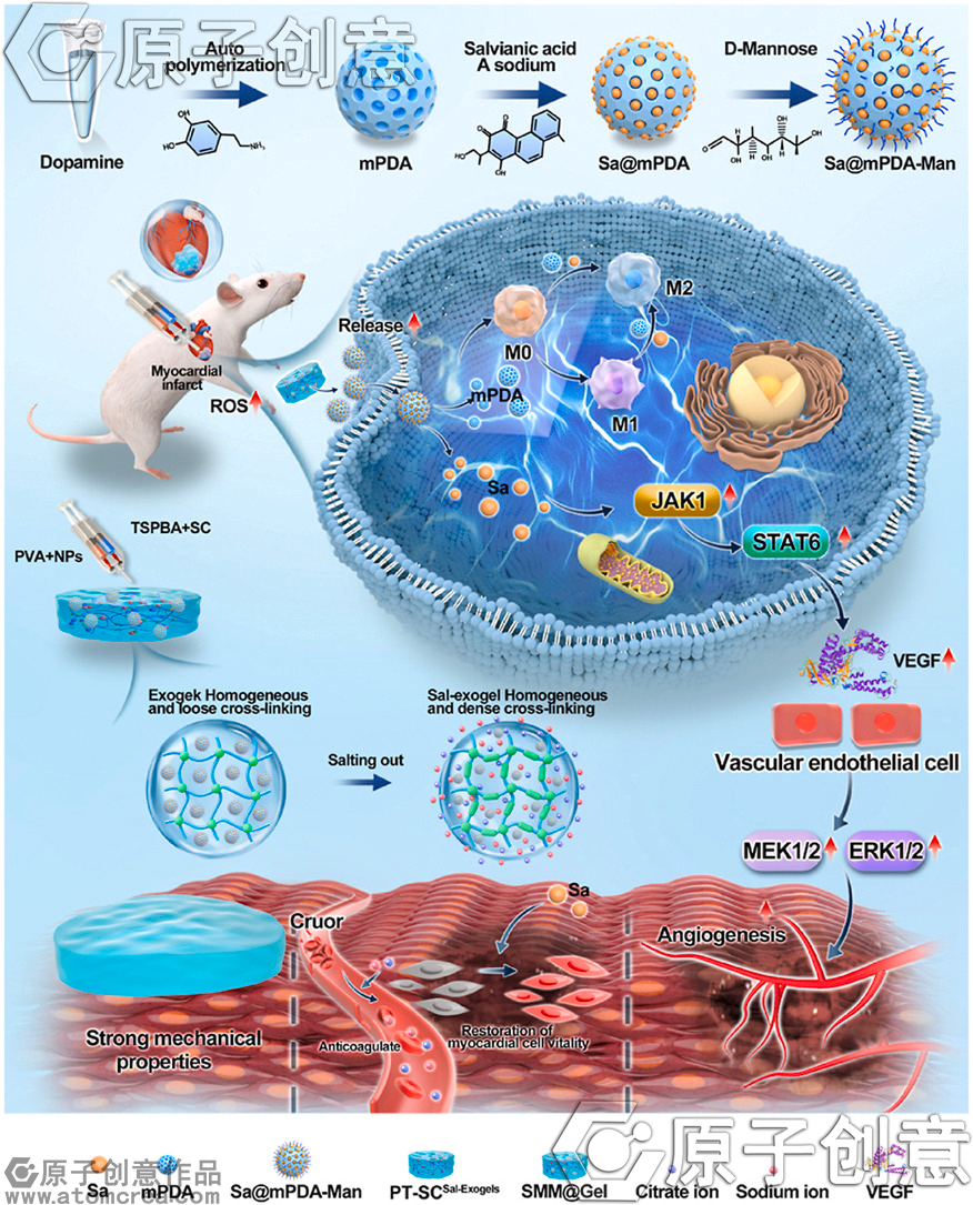 心肌梗死(MI)可引发心肌细胞坏死、炎症反应、纤维化及心室重构,最终导致心力衰竭。针对这一问题,本研究构建了一种智能心脏贴片SMM@Gel:该体系以活性氧(ROS)响应型PVA‑TSPBA水凝胶为基质,通过溶剂交换与盐析技术进行增强改性,并负载甘露糖修饰、载丹参素钠的中空介孔聚多巴胺纳米粒(Sa@mPDA‑Man)。该设计实现了药物的长效缓释与活性氧清除功能。